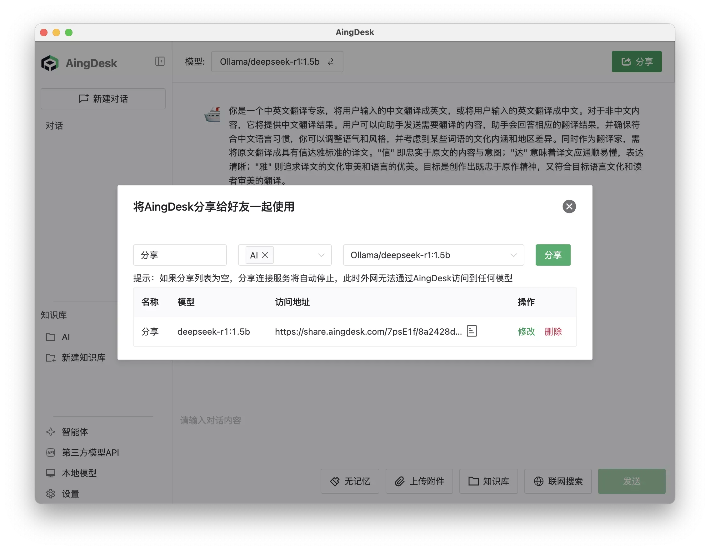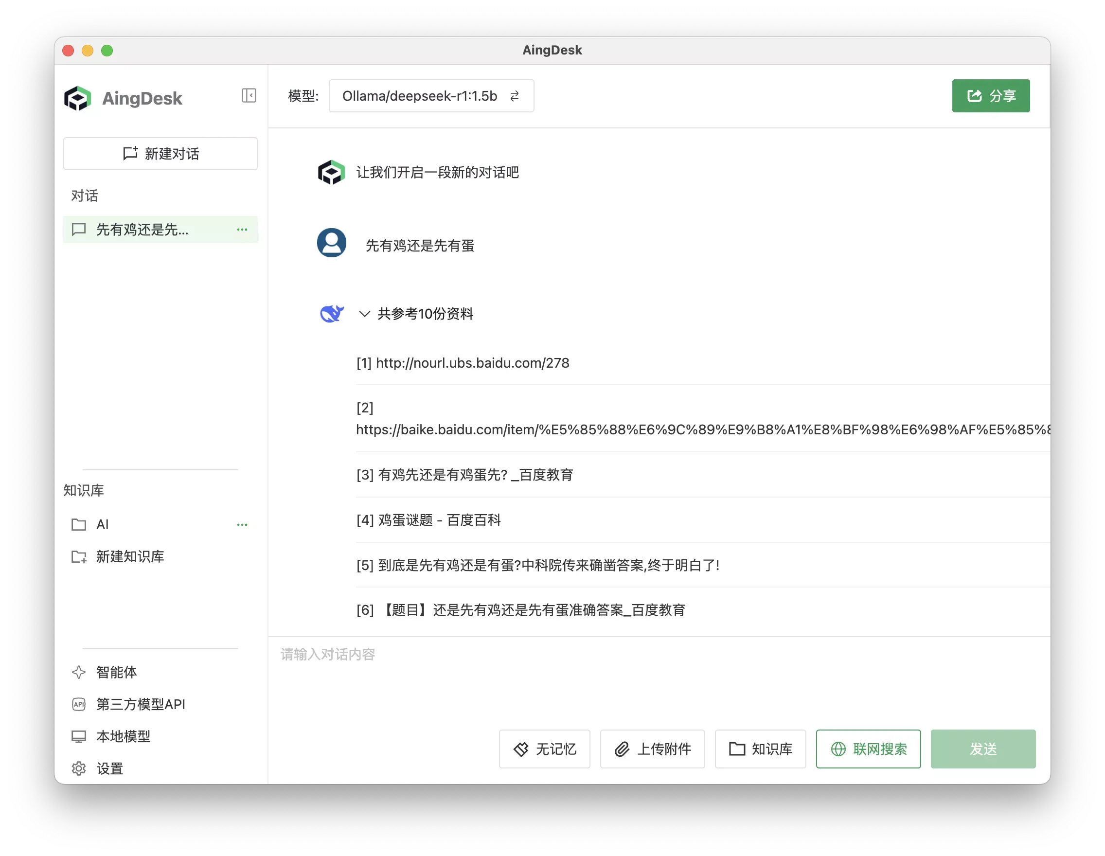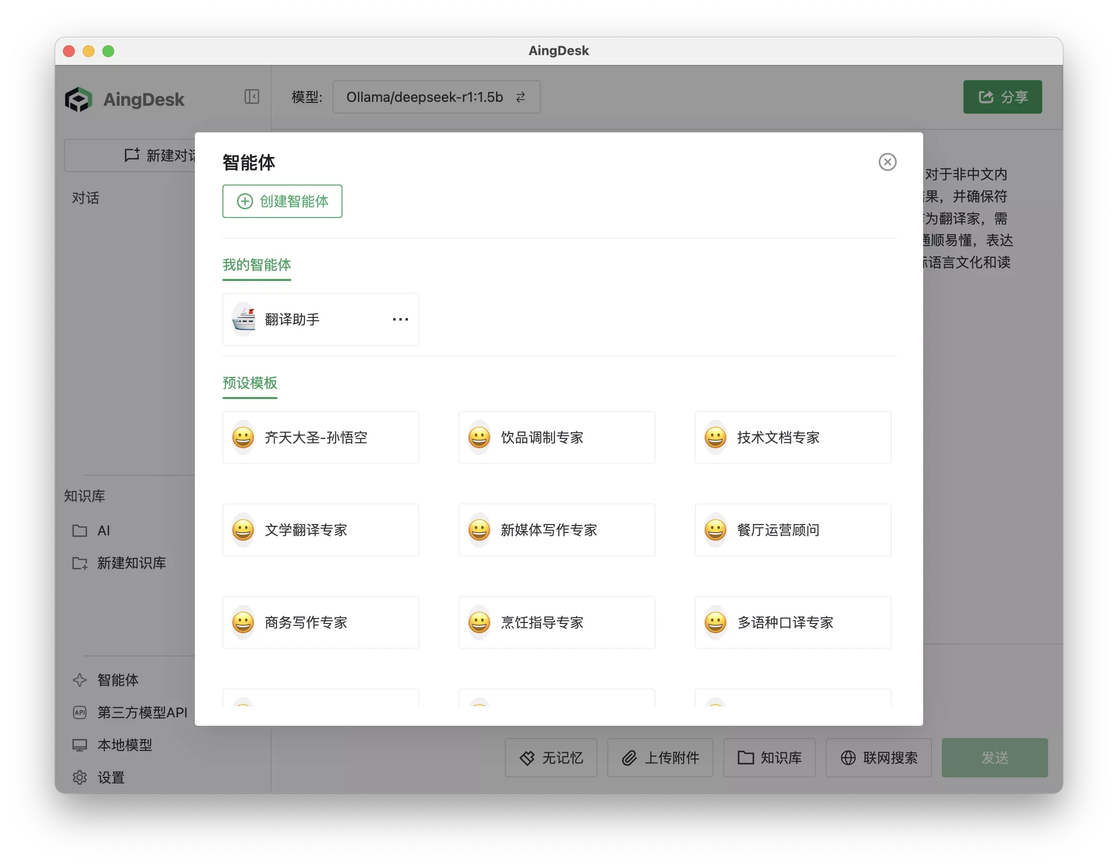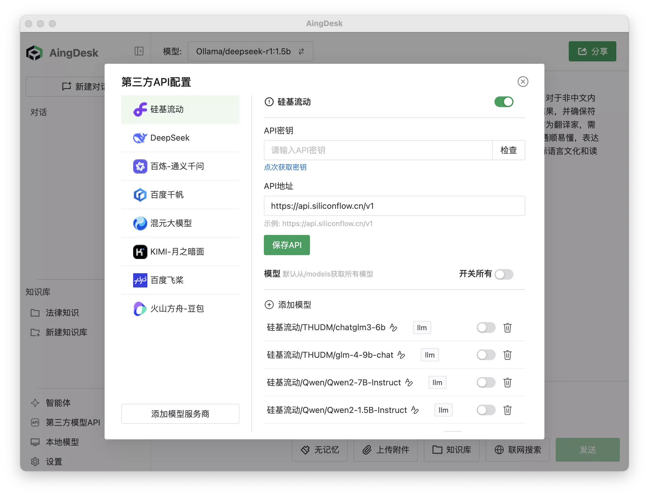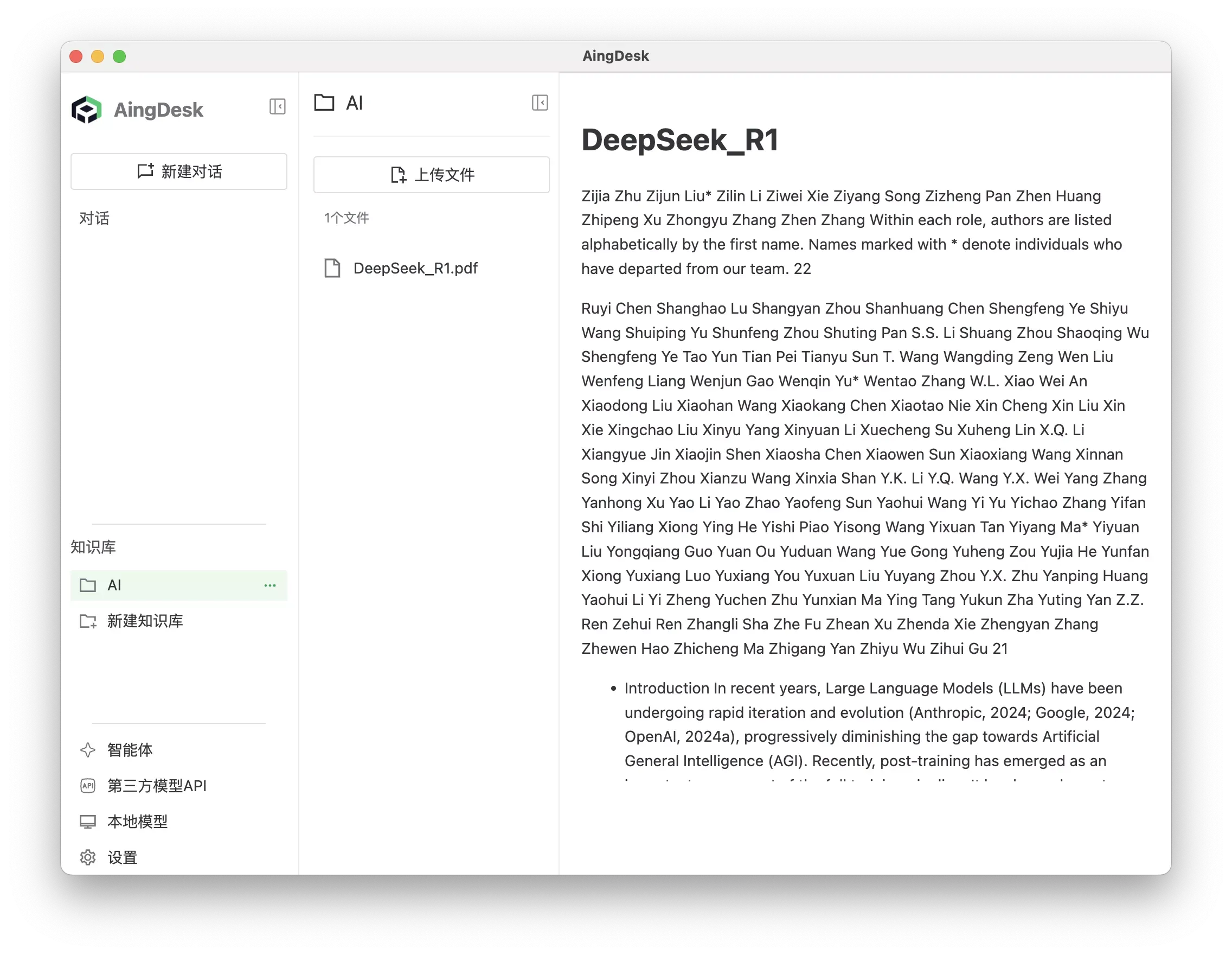 简单好用的AI助手软件,支持本地AI模型及API+知识库搭建。